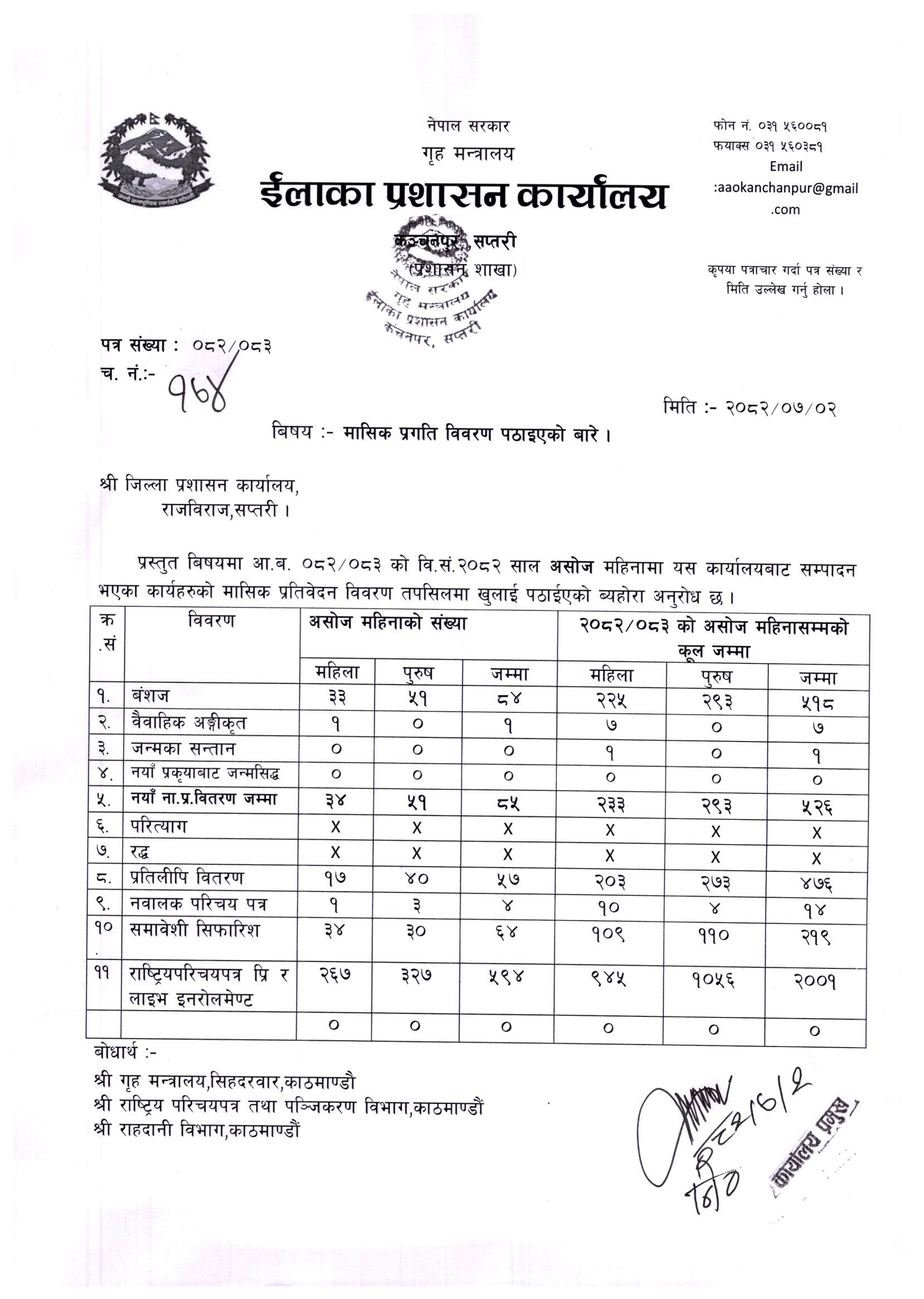 २०८२ साल असाेज महिनाकाे मासिक प्रगति प्रतिवेदन ।